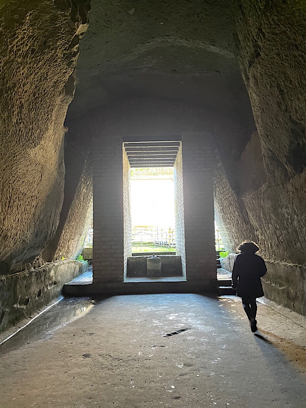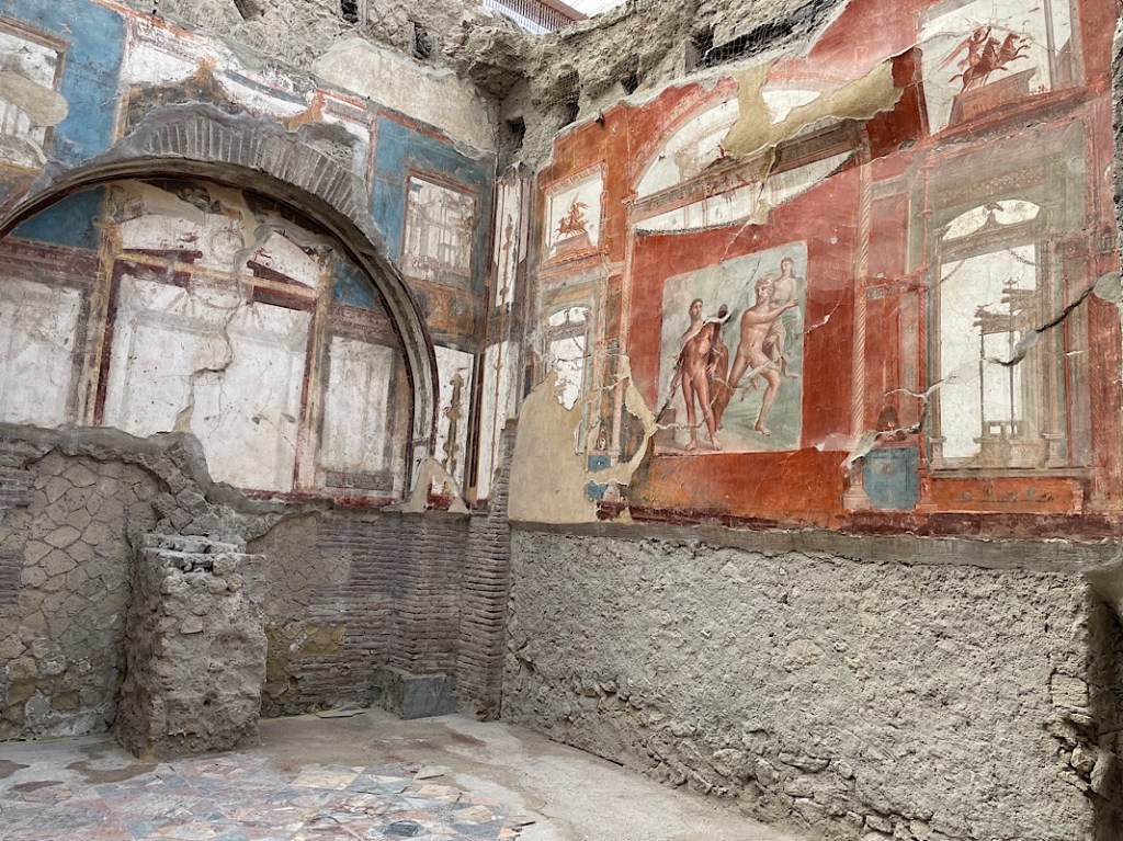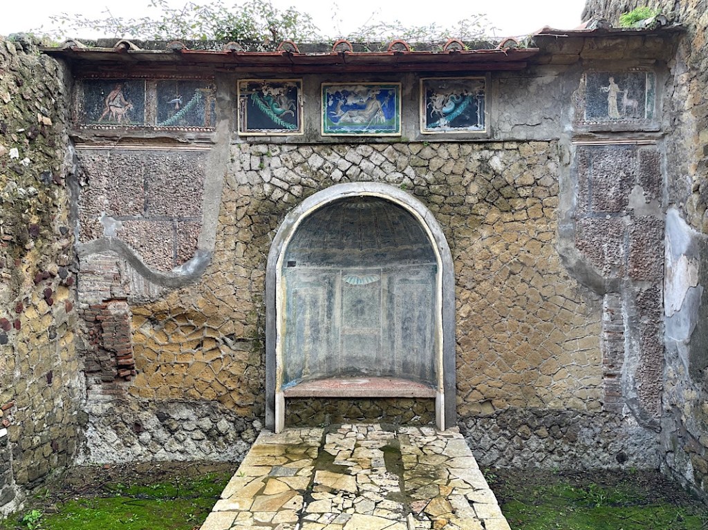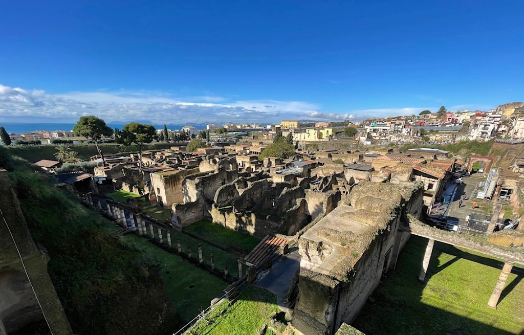 After a late finish last night in Naples, we had a slower start this Sunday morning. It was another very rainy night, but by 11am there was a break in the clouds and we ventured out to Herculaneum. A short train journey from the station next door. Herculaneum lies halfway to Naples and more directly in the path of Vesuvius’ eruption in 79 BC, in the modern day town of Erocolano.