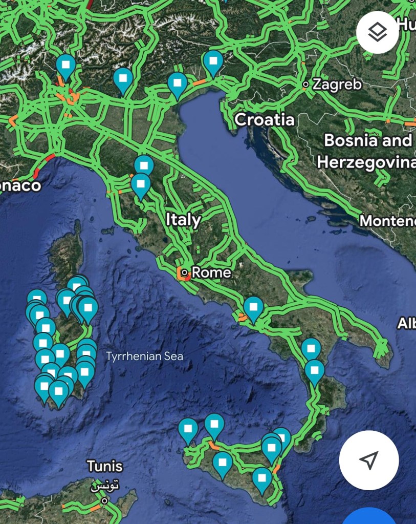We were on the road at 07:30 this morning all van servicing done, ready for our next adventures in France. We have had a fabulous time in Italy, although we are leaving behind lots to come back and see at another time, especially in mainland Italy. We did a pretty thorough tour of Sardinia, when our stay was extended by a cancelled ferry, but we would go back there again anyway because we really liked it ๐๐
