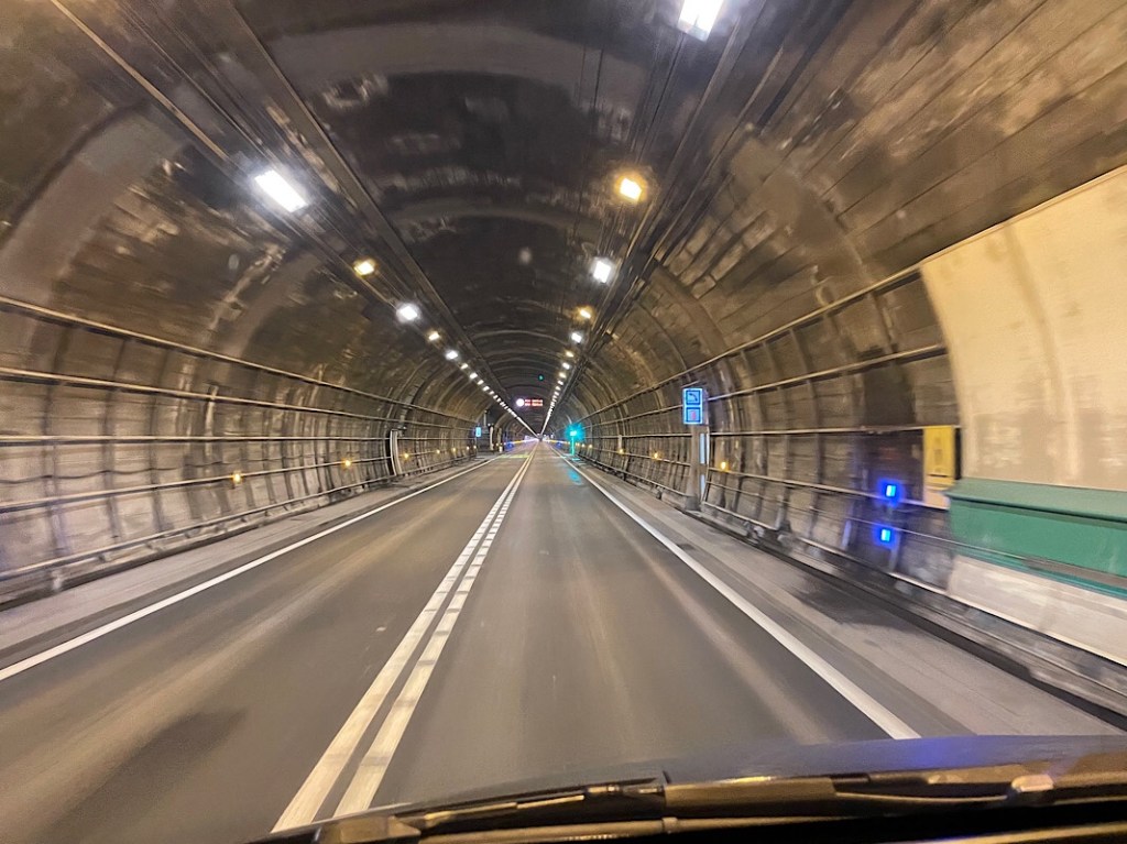 It was a decent trip to the Mount Blanc tunnel even though we had to skirt both Milan and Turin at rush hour, but despite fairly heavy traffic and the usual Italian style of driving, traffic flowed smoothly. We passed through multiple tunnels and we reached the far west of Italy where the place names were distinctly French sounding as the borders have no doubt shifted. We navigated the French / Italian signs to the right lane and pay booth for among Blanc tunnel. We were told by the helpful toll booth man he would need to check our height. It is 2.7x more expensive to be over 3m and we expected to pay that, as according to Hymer we are 305cm. However the man came out from the booth with his L-shaped measuring stick and ruled us to be under 3m. Result!