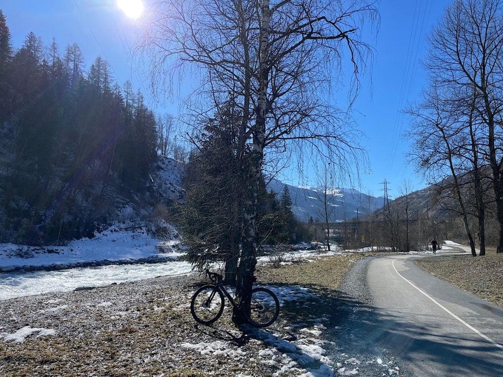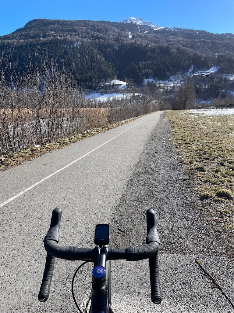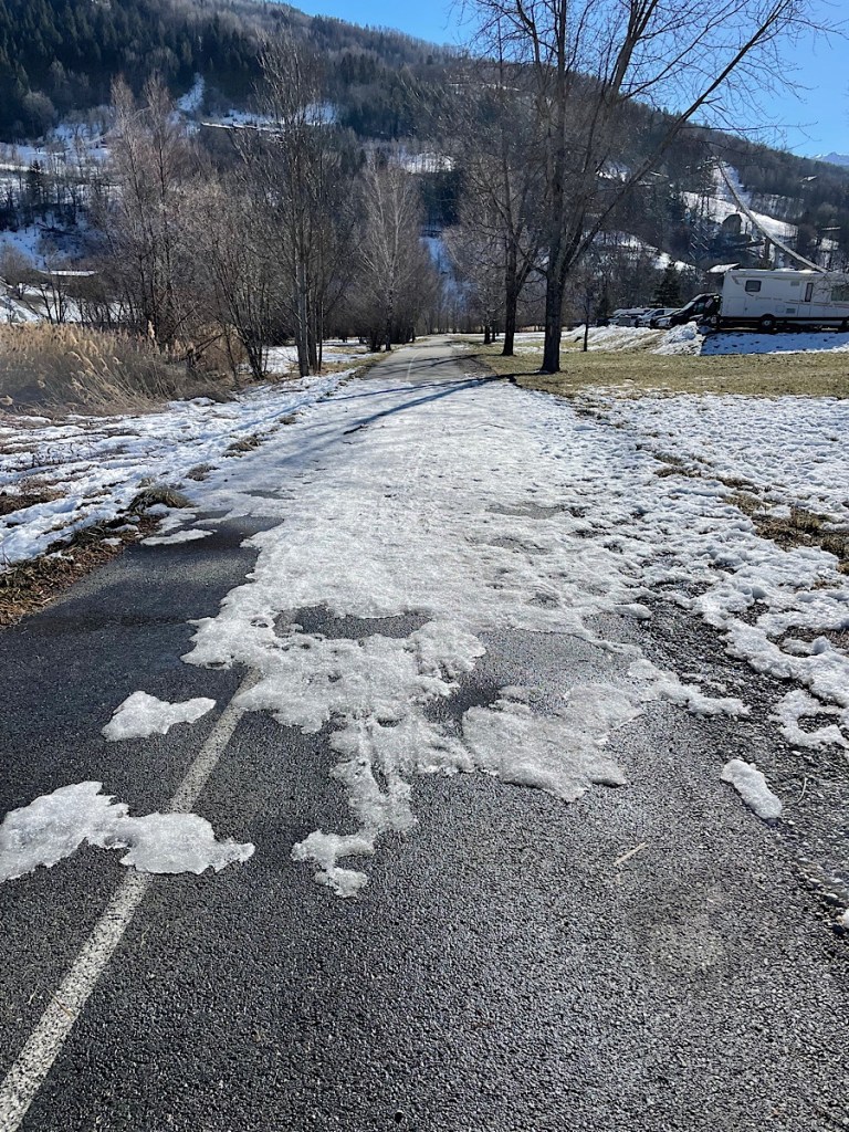 Today I finally got the bike out again. Most of the routes near here on my various apps are summer time routes up mountains to 4000ft+ which is now in the snow line. I decided instead to take the cycle route through the valley. It was really pretty. There was a very impressive hydropower station in the stream causing some bubbling rapids. However being in the valley the route was crossed by patches of ice / snow not ideal on my slick wheeled road bike. I walked over the first couple of patches before I got up my nerve to cycle over. As I headed toward Landry the snow was increasing so I took the road.
