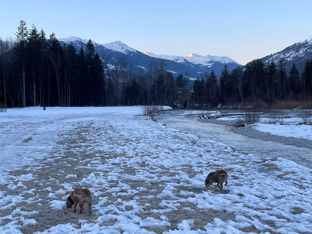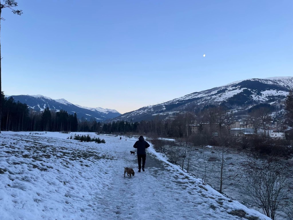 There is also some lovely dog walking in woods behind us and alongside the river Isère. It is so nice to get the dogs off lead several times a day and they are loving it, they go crazy in the snow and add to that all the sticks laying around to fight over it is often pretty noisy affair our walks.