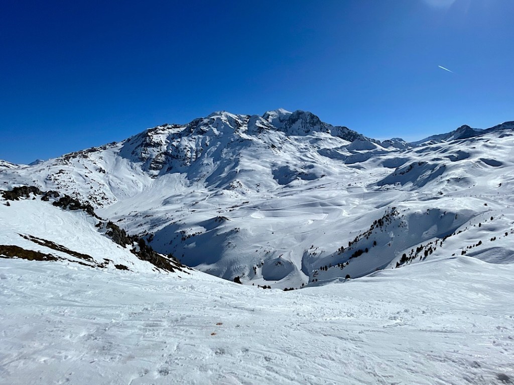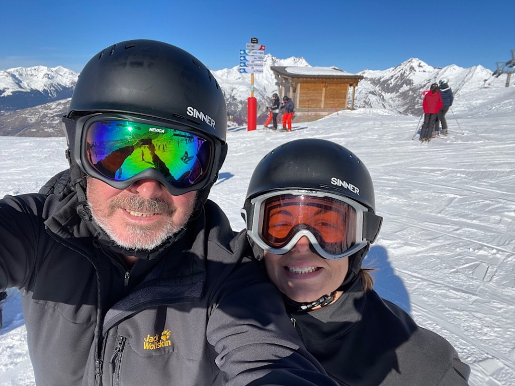 Kevin and I celebrated our 14th Wedding Anniversary this week with our first day of skiing and a ski lesson. Our last time on the slopes was on our 10th Anniversary in Val Thorens just up the road and before that was New Zealand in 2014 for 2 days and then 20 years ago so we are pretty rusty. We had already picked up our rental ski equipment so headed up the funicular to the slopes, it is both French and English school holidays this week so it is pretty busy. The sun is shining and it is clear blue skies as we ascend on the chairlift for the first time. However, we are accidentally on the wrong lift ๐ณ so we do not get the short easy blue to start us off but a longer one from the top of the longer lift. However, we soon find that the blue runs here are really well cared for, despite no snow since 17th January and they are wide, well sign posted, not too tricky plus when we set off we had it mostly to ourselves.