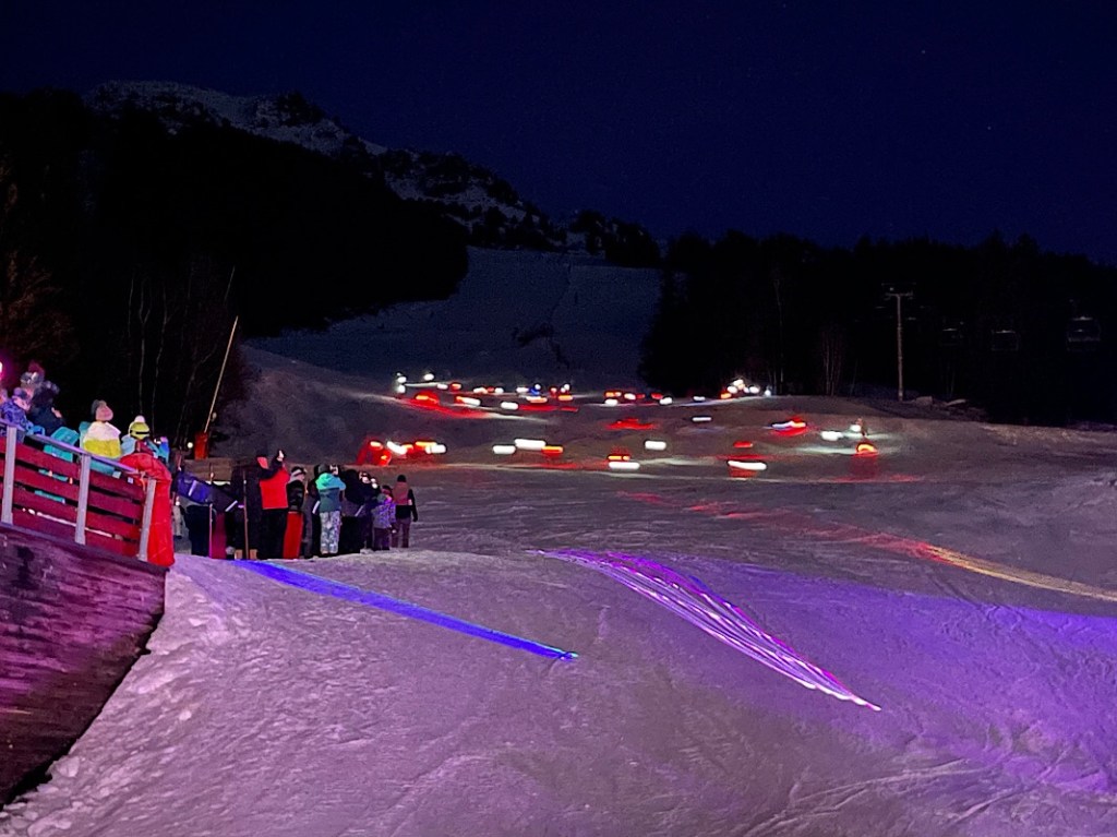Sean and Alexโs first afternoon was filled with getting fitted out with ski gear and catching up. Later, we got to watch all of the instructors doing a torchlight procession down the mountain at 18:30 complete with open air disco on the snow and strobe lighting. There was quite a crowd and a great atmosphere as we saw the patriotic red, white and blue LEDs winding down the mountain in the dark. Though Kevin was regaling us on how using LEDs was a cop out and he did the same with a flaming Roman candle years ago on his first ski trip ๐ We did have fun though watching all the instructors gathering in the bar prior to the run, trying to read their name tags and work out which was Roland, Alex and Seanโs instructor for the next day. A couple of the younger instructors spotted the attention and I think were rather disappointed not to be teaching the gorgeous Alex and Sean when we explained the reason for interest ๐๐