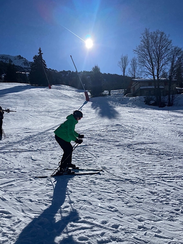 This morning we met for Seanโs first ever day of skiing and Alexโs first in 20 years, since she, Kevin and I went to Aviemore on her 9th birthday. Kevin and I provided some rudimentary lessons on putting on skis and snow ploughs until their instructor Roland arrived at 12 (only lunchtime lessons were left available on this busy week). As they went off Kevin and I retraced our steps from our lesson up to Arc 2000, this time getting to stop for photos of the view ๐.