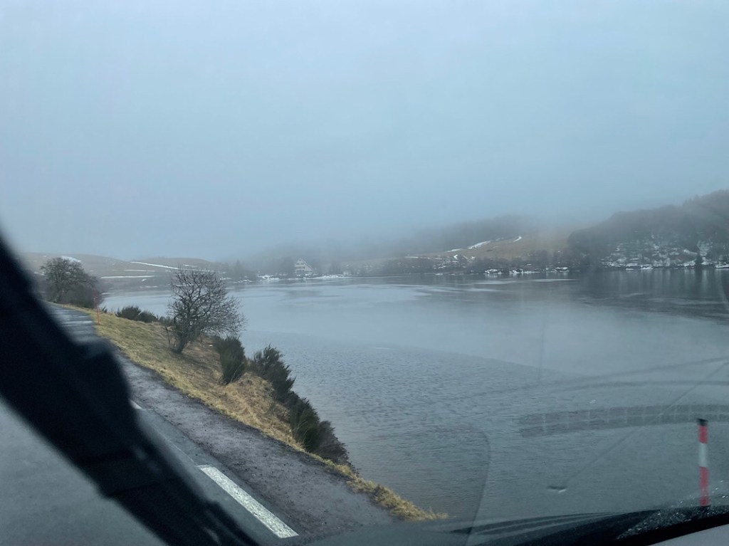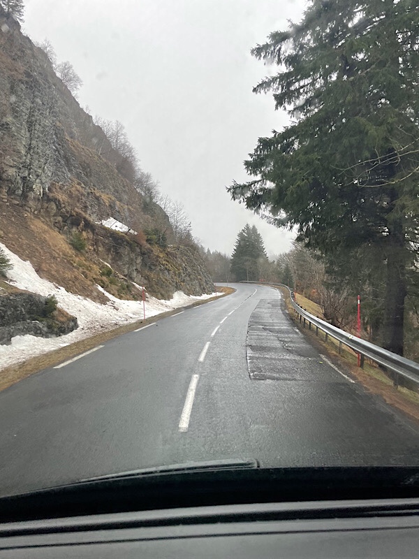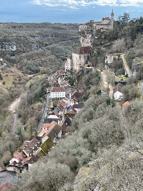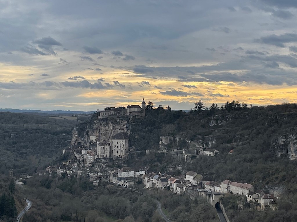 We decided to carry on to our next planned overnight stop at Rocamadour as the forecast was not due to improve for the next few days. I had seen photos of Rocamadour for years, teetering on the side of a cliff and it has been on my radar to visit that and the Dordogne region for sometime. The journey from Puy de Dôme took us right through the middle of l’Aubrac National Park with its twisty roads, mountain lakes and dramatic scenery. We were back in the snow line for a while, but the sat-nav’s attempt to take us over a mountain pass was thwarted by a closed road.
