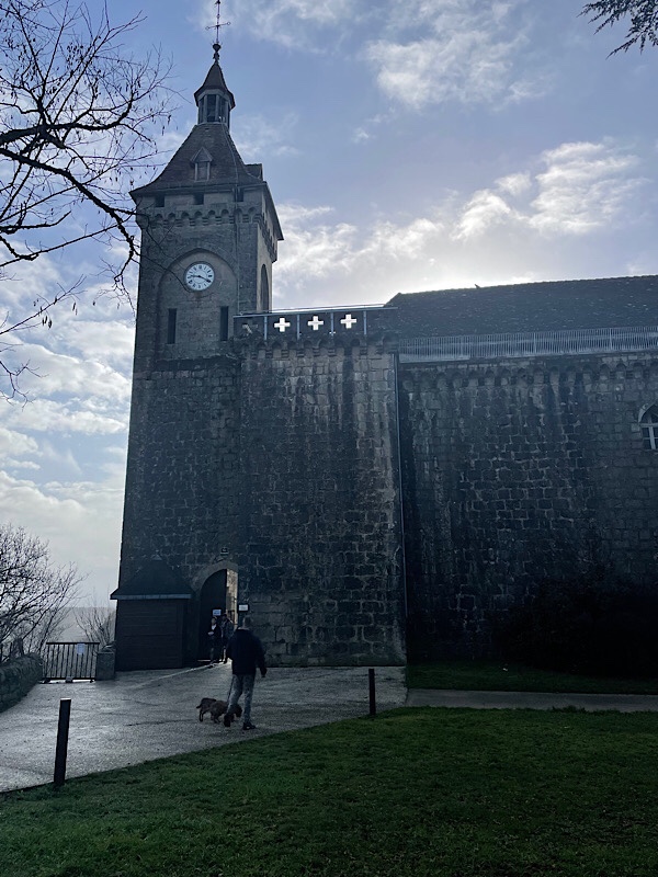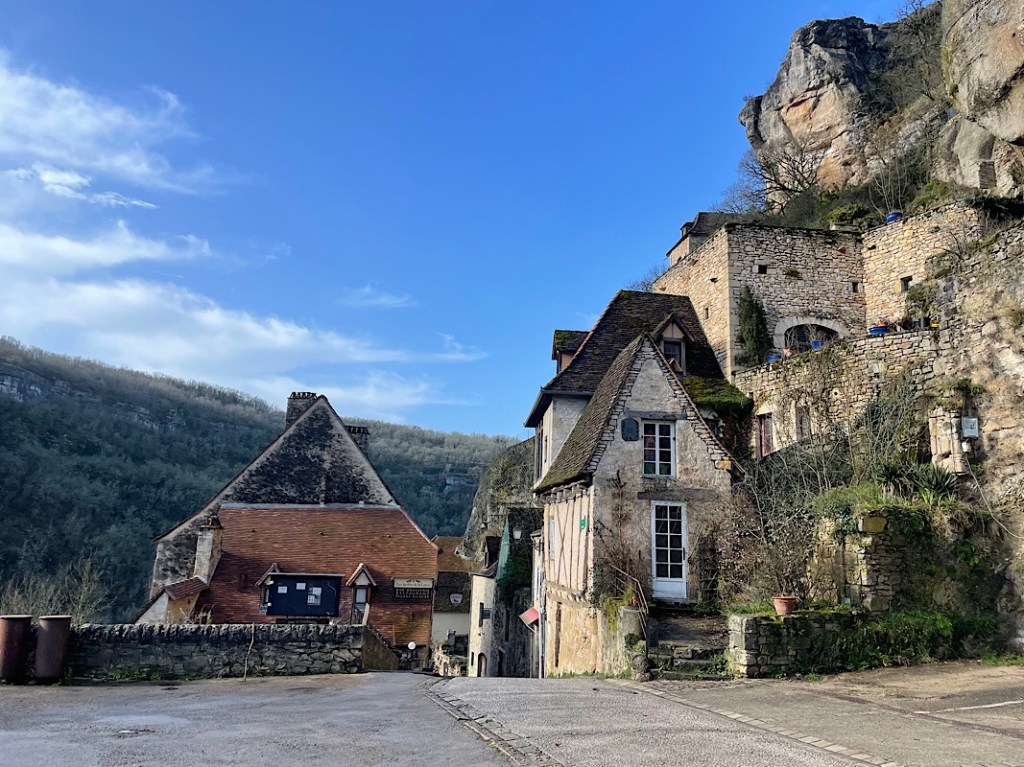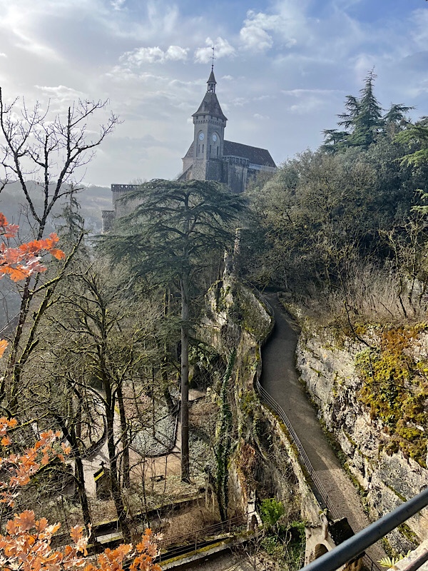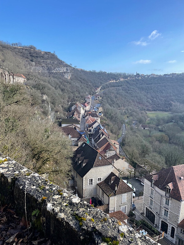 We started our day before breakfast in Rocamadour with a 3 mile loop tour of the medieval village on the cliff. We started at the castle ramparts, though these were sadly closed, we were able to descend the winding path down the cliff side. We had the place to ourselves, except for one other couple and some builders completing out of season repairs. We passed a shrine in one of the cliff side caves and then the sanctuary below. It really is quite a climb down, first via the path and then several flights of stairs, the elevator options not available for out of season visitors. Although we and the dogs were more than happy to get some morning exercise anyway.