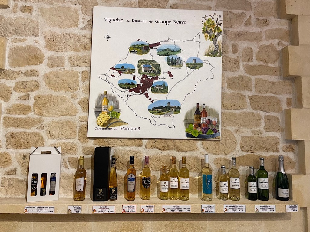 After lunch, we headed toward Montbazillac and Bergerac, surrounded on all sides by vineyards. So, what could we do but sample their wares? It is impossible to select from the hundreds of vineyards in the area, all offering free tasting. We decided to try at the locations which offer motorhome stays under the French Passion scheme which offer free motorhome parking from winegrowers, farmers and tradespeople in return for visiting their stores but with no obligation to buy.