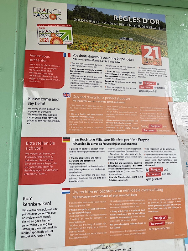 Finally we went onto “Avinturiers” with 5 dedicated motorhome pitches between the vines in the Passion scheme. We headed to the shop but found it closed and we were about to head off when a quad bike came dashing across to the fields towards us. The quad rider turns out to be Monsieur Camus, the owner who greets us with a warm smile and a flood of French. He is though highly demonstrative and quite understandable.
