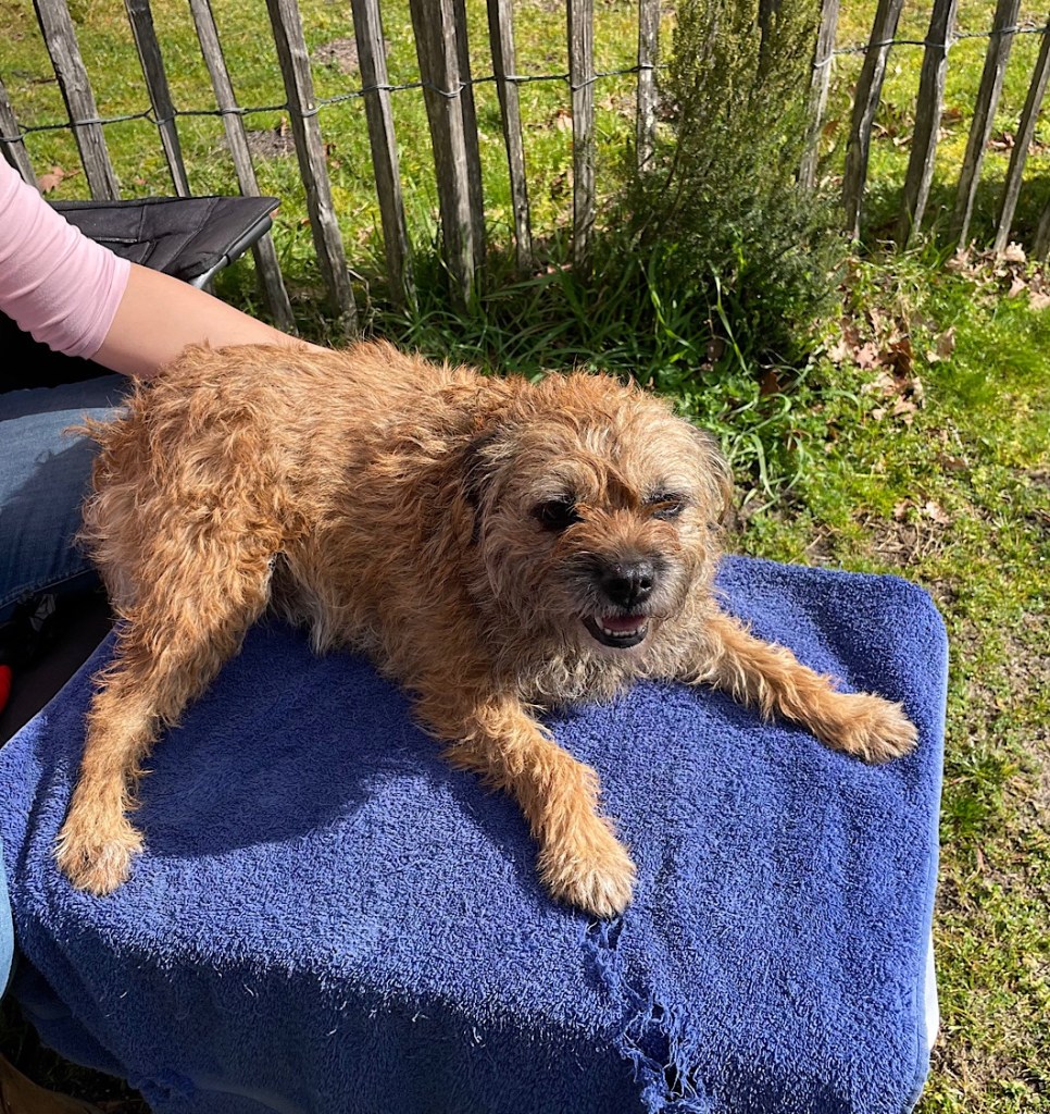 Then we sat out with the deckchairs for what felt like the first time in months. The van was reading 21.5 degrees C on the way over and despite a bit of a breeze it was lovely. Not used to sitting long like this, as soon as I’d had my lunch, I decided Lizzy our woolly mammoth Border terrier needed hand stripping. After being perfectly suited to the Alps only a week or so ago, suddenly she was decided over-coated and panting in the sun. It is always quite a big job for Lizzy, which she is not over fond of, but probably better to do it now before her possible op.