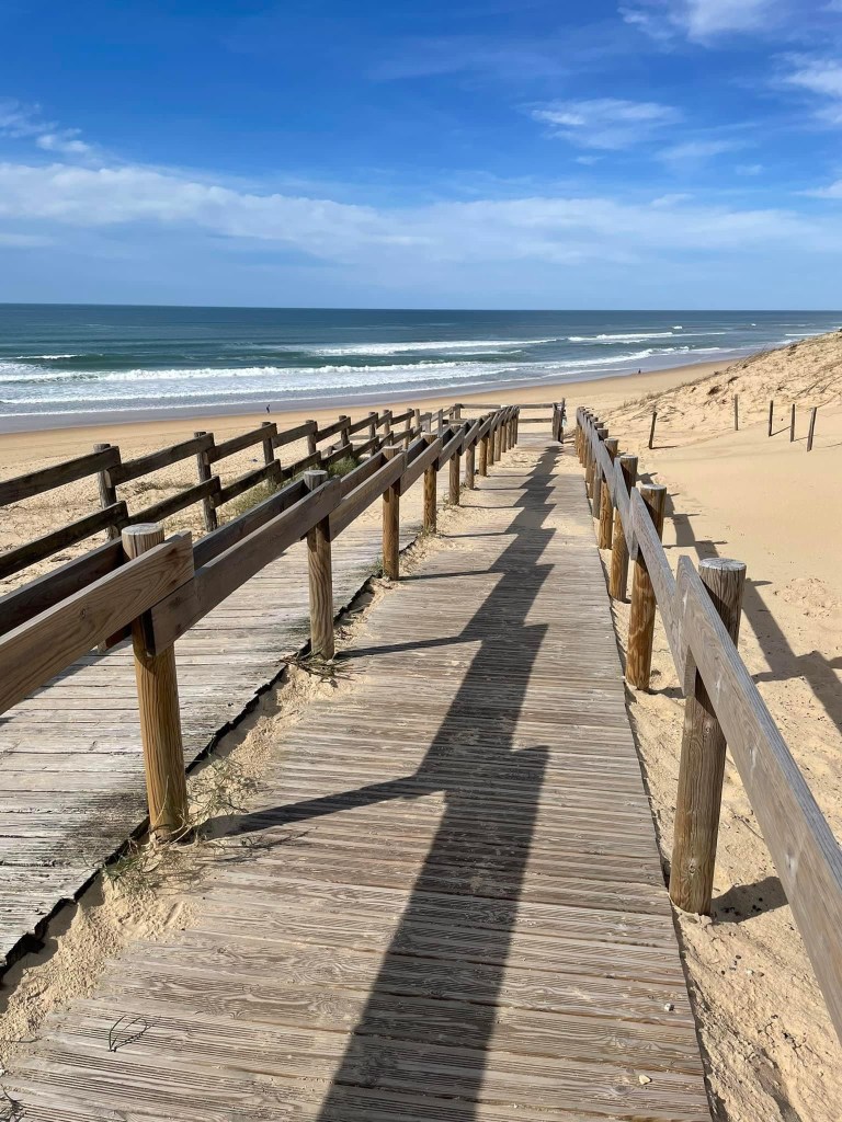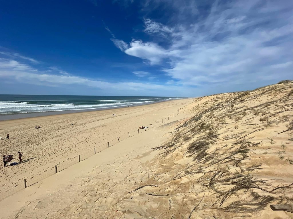 We then moved south to Basque Country with the occasional multi-lingual sign and several delicatessens selling local Basque products. The architecture is changing too, to wood framed buildings, some almost Alpine looking as we also head towards the Pyrenees. Thursday had forecasts of 25 degrees (☀️!) so we decided it was time to hit the beach. There is a golden sandy beach all down the South West coast of France so we had plenty to choose from. We opted for a small Aire near Messanges at the back of the sun dunes, nothing around except the equally expansive mainly pine forests which also lines this coast.
