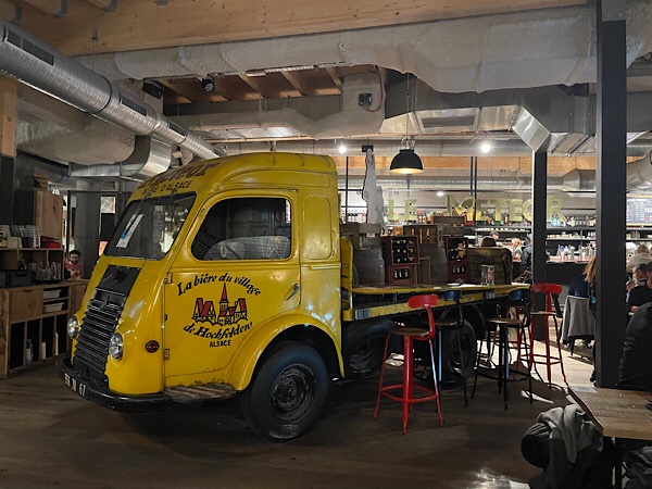 The menu was full of various pork items, schnitzels, sausages, sauerkraut etc of the Alsace version, bar snacks were sausages and pretzels. The local Meteor beer was very German but very nice, in a modern bar but with a very French classic Citroen van for decor in the middle, demonstrating the very mixed culture which is Alsace.