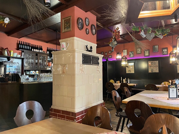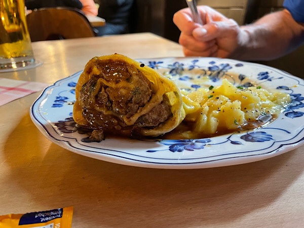 We were pretty chilly from our couple of mile walk along the river and decided to find somewhere warm. This being our first stop in Germany, yet again we needed to survey the local cuisine. We opted for a very cute traditional Herrenkeller restaurant, originally brewery, with forbidding looking double doors and a full length curtain to negotiate on the way, but thankfully we were not the only ones there. The wooden tavern was arranged around a central chimney / oven. Kevin tried the local German ravioli, which classically was vastly over-engineered versus its Italian counterpart. Not for the Germans the scanty scrap of meat and flimsy parcel of pasta. The local variety was packed with meat on multiple layers, more like Beef Wellington than ravioli. Amazingly having lived on salad and fries in Germany last time, they even had a vegan / vegetarian menu for me too.