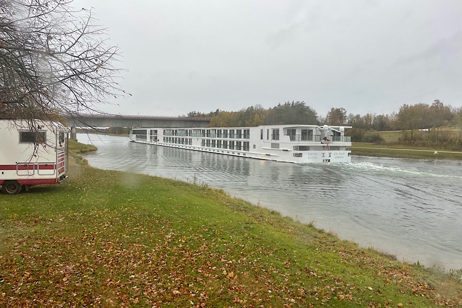 On Sunday though it was time to start making our way north towards Frankfurt through 2 days of almost constant rain, for hopefully our last truck appointment for a while. We are visiting Off-road-Motorhome Services at their base in a Mercedes dealership in Frankfurt. We had a pleasant stop off along the canal at Hilpoltstein, where we had the odd experience of watching huge Viking River Cruise boats passing us almost silently at night, their big glass dome windows displaying all the diners passing whilst seated for a formal dinner.