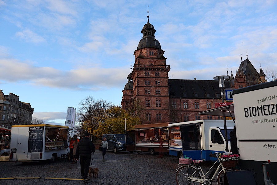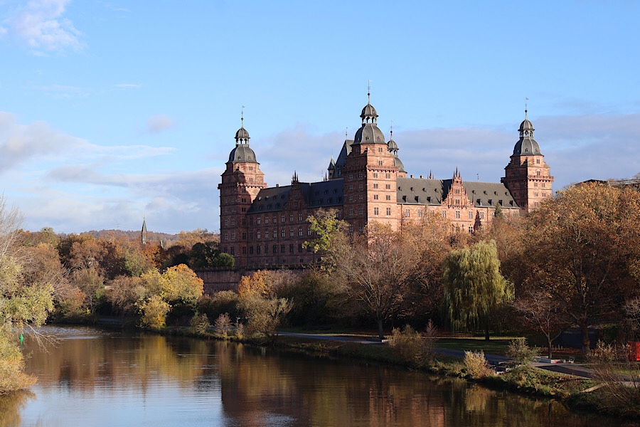 The morning brought a welcome respite to the downpour and we took the dogs out for a pleasant walk along the banks of the Main, past the imposing and impressive red brick facade of Johannisburg Palace. Built between 1605 and 1614 for Archbishop-Elector Johann Schweikard von Kronberg as a second home, it remained in use by the archbishop-electors of Mainz until 1803. The massive four winged complex was mainly funded by taxes from the fiefdom. Its impressive architecture standing in testament to the luxuries enjoyed by the few at the cost of the many.