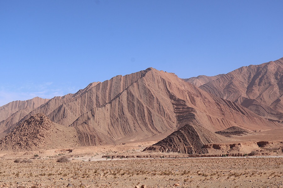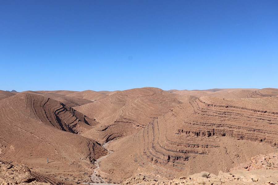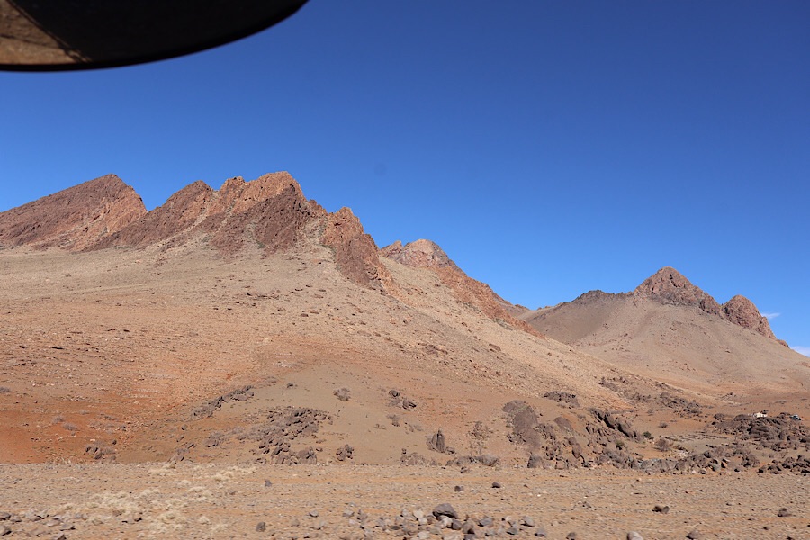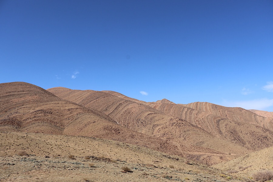 The drive to Tafraoute through the Anti-Atlas was spectacular. First down an R-grade rural road, then to a single track P-grade road, which is prone to closures due to landslides etc. Luckily we were able to drive the full length, though sometimes over the scars of previous damage. The Anti-Atlas have just as much wow factor as the High-Atlas, with deep gorges, multiples colours of rock and fascinating ring patterns, ridges and formations which tell a little of the forces involved in creating this range. Villages are far and few, often in seemingly precariously high or low valley spots. We passed over a col at about 1800m, as often seems to be the case, it was recognisable by the mobile phone mast at its peak.