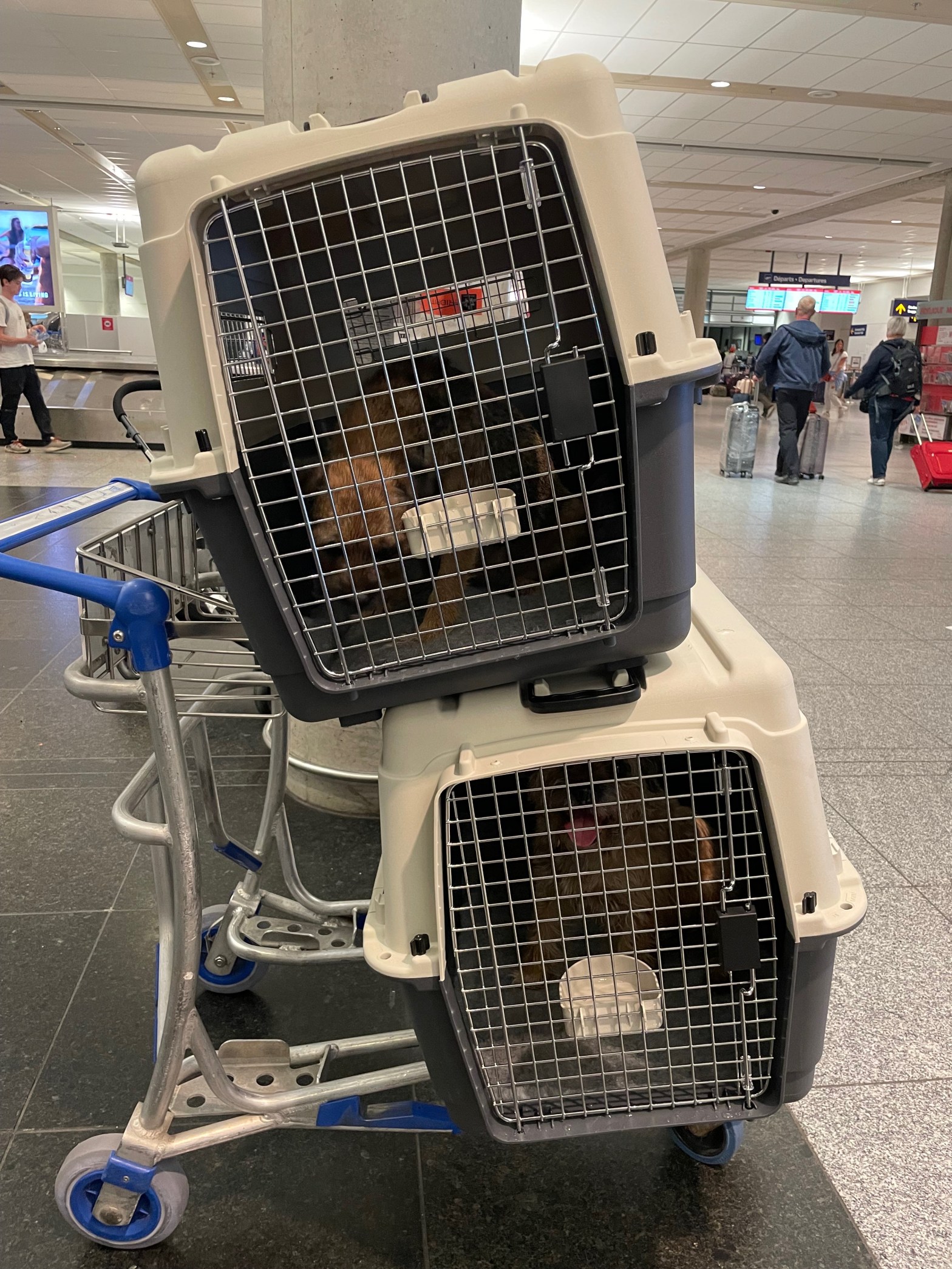 Please note that the dog air crates are extremely bulky, we opted to not use the detachable wheels on the crate but lift them onto a luggage cart. This was easier for us as our dogs are only 10kg and makes it easier for transport to and from the airport. We had to plan ahead to book a minibus taxi to the airport and had to get a limo taxi at YUL to fit the crates in. Even in the Volvo X60 we hired on a one-way basis to get to LHR we had to drop both backseats to get the crates in.