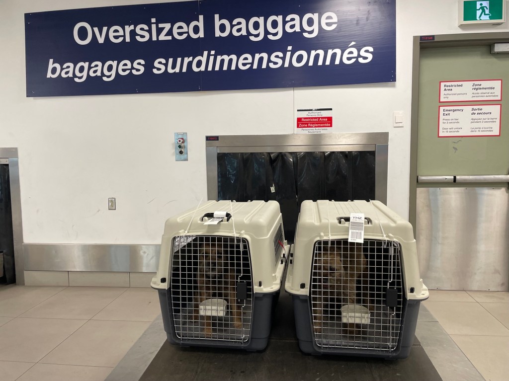 You are advised to arrive extra early when checking in with dogs, we arrived 3 hours before our flight time from Heathrow (LHR) to Montreal (YUL). The procedure is that you go to check in at the usual check in desks, the check-in staff issue a baggage tag for each dog crate. They also get you to fill in a Canadian customs form which is attached to each crate with the dog’s name, your address and destination address. It asks if the dogs have been sedated, which is not advised. The check in staff complete the other side to confirm that the crate is of sufficient quality, size etc. This form is attached to the crate.